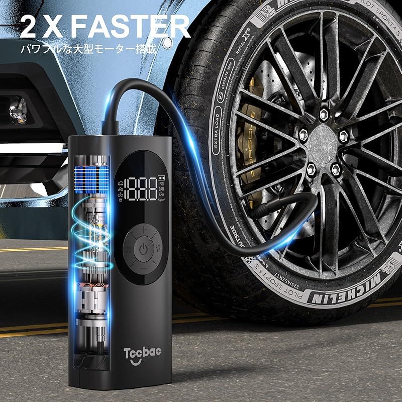 商品名:TCCBAC 自転車 空気入れ 電動空気入れ 車 充電式 最大圧力150PSI 6000mAh 空気圧指定可 自動車タイヤエアーポンプ ロードバイク/バイク/ボール/小型自動車 携帯 2倍の膨張速度 自動停止 仏/英/米式バルブ対応 Type-C充電 自動停止