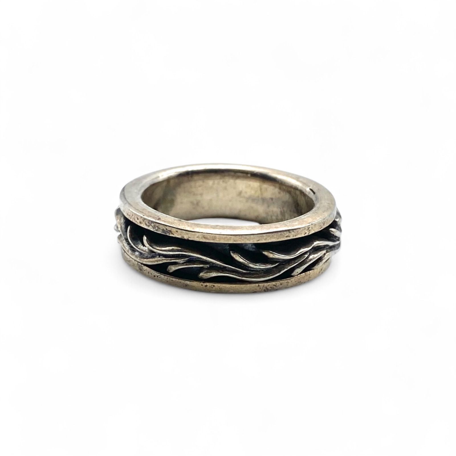 シルバー925に施された唐草模様を、燻しで立体的に仕上げたリング。深い陰影が模様を強調し、力強くも上品な雰囲気を纏います。ヴィンテージらしい重厚な味わいが魅力です。また、中央部は回転する仕様となっており、遊び心が感じられます。