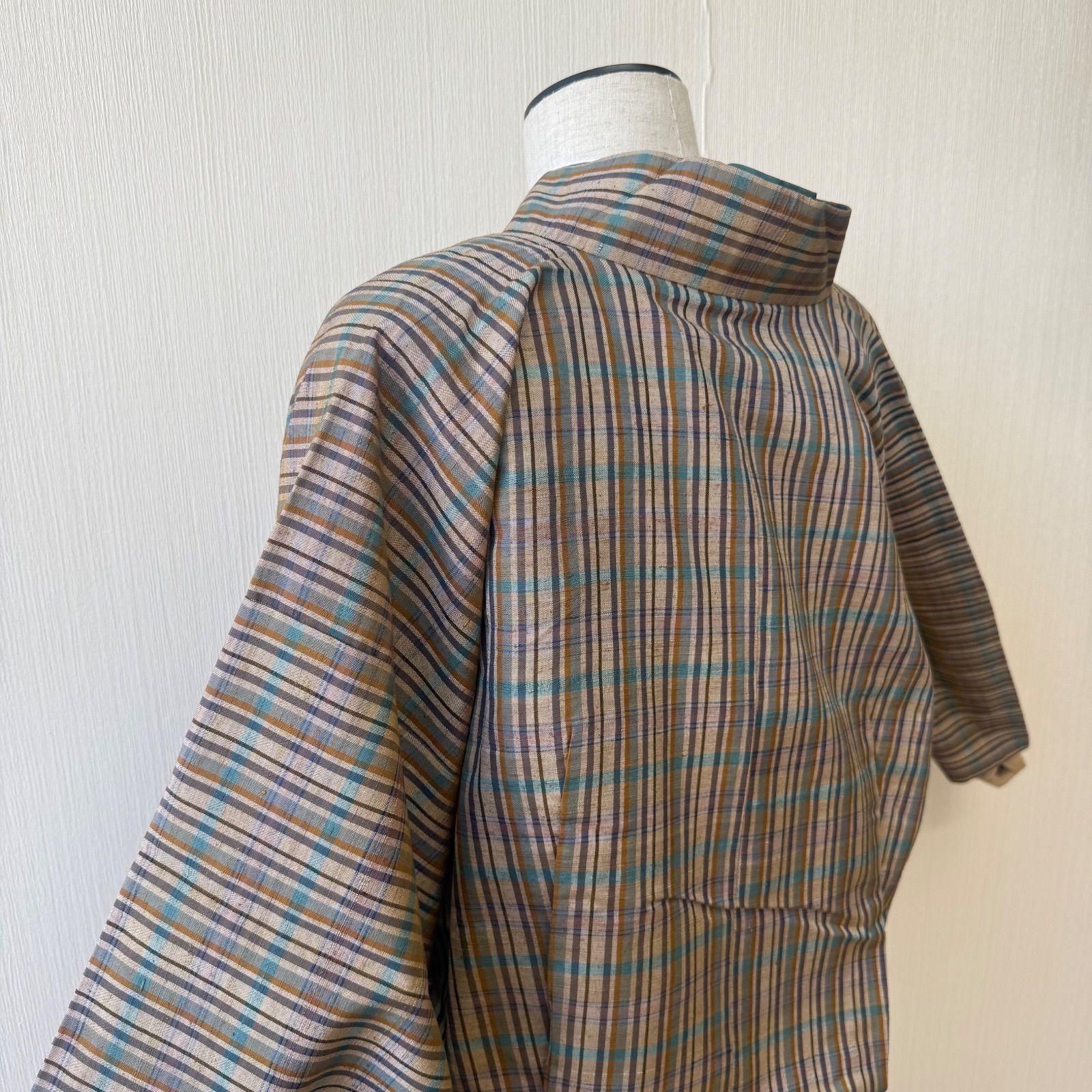 着物 二部式着物 正絹 紬 袷 二部式 格子 ベージュ リサイクル着物 z-556